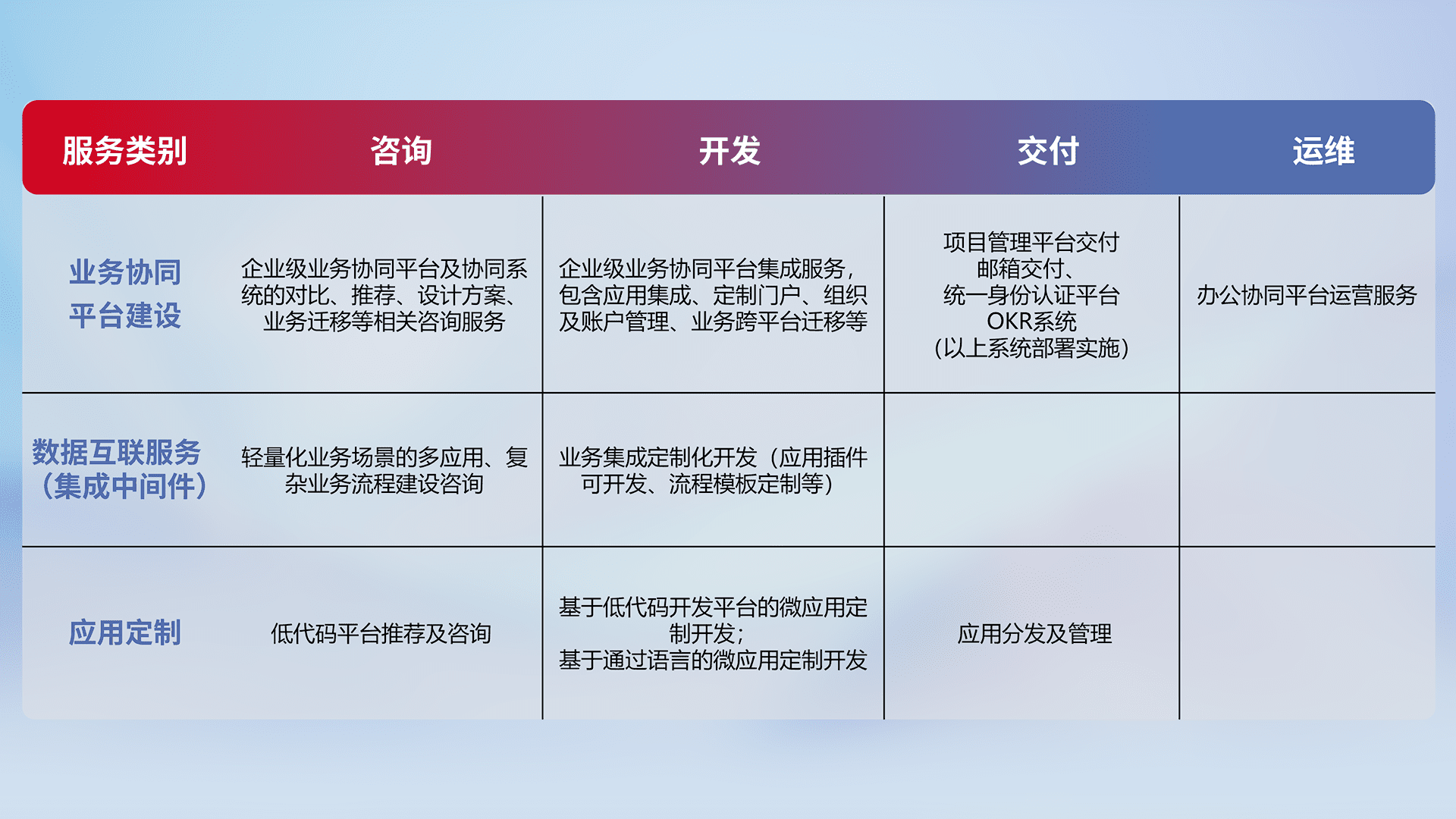 针对钉钉、、、、企微、、IDaas等平台级产品提供产品的规划、、、方案、、交付、、、、定制化开发等服务,,,实现如统一协同办公、、智能客户服务、、、、混合会议管理、、智能数据查询、、、等业务场景,,,,实现数字化转型。。。